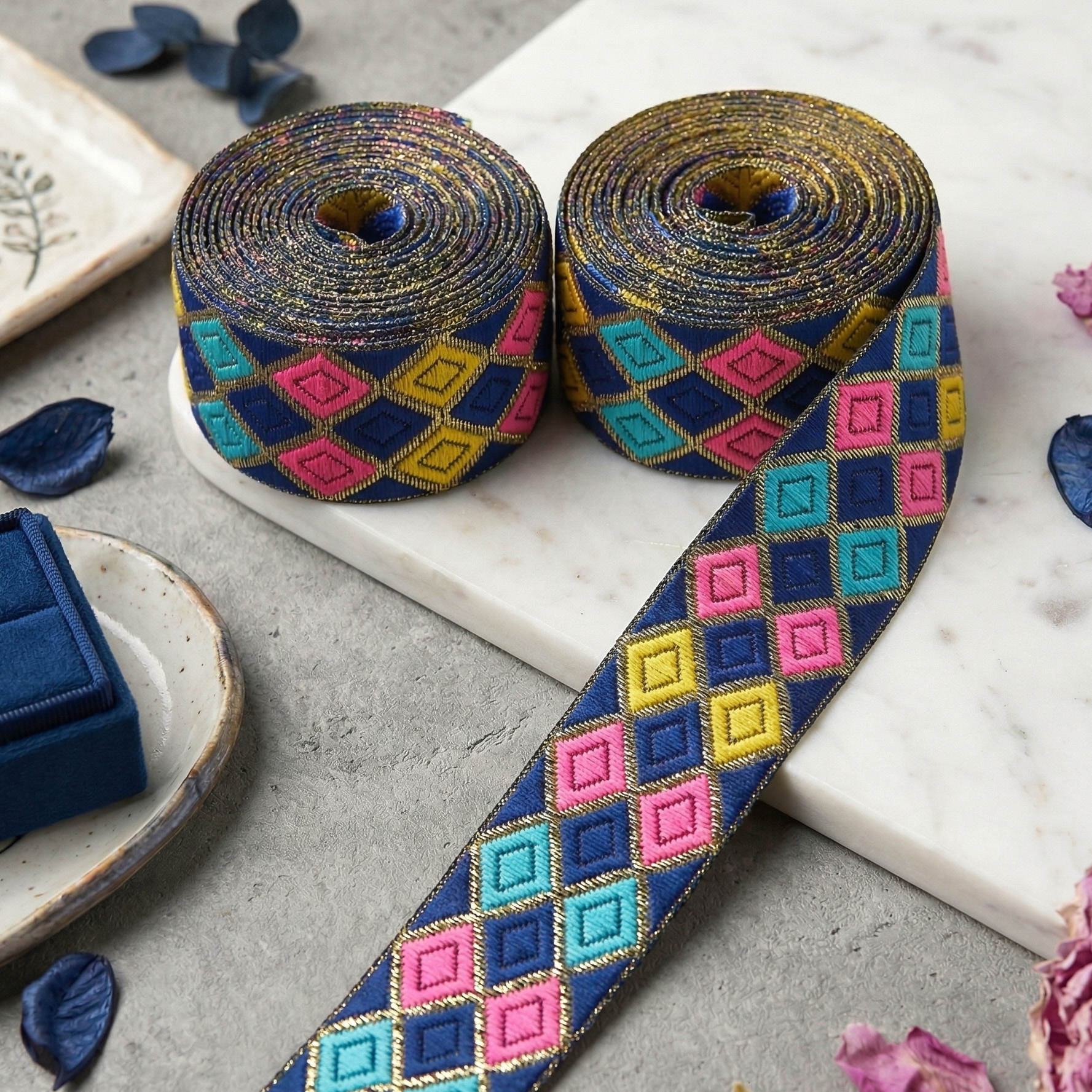 Verleihe Deinen Nähprojekten einen Hauch von Luxus mit diesem edlen, 25 mm breiten Webband! Das aufwendige geometrische Rautenmuster, durchsetzt mit funkelnden Goldfäden, setzt glanzvolle Akzente auf jedem Stoff. Ob als Verzierung für Taschen, Kissen, Kleidung oder für individuelle Accessoires – dieses hochwertige Band zieht garantiert alle Blicke auf sich.