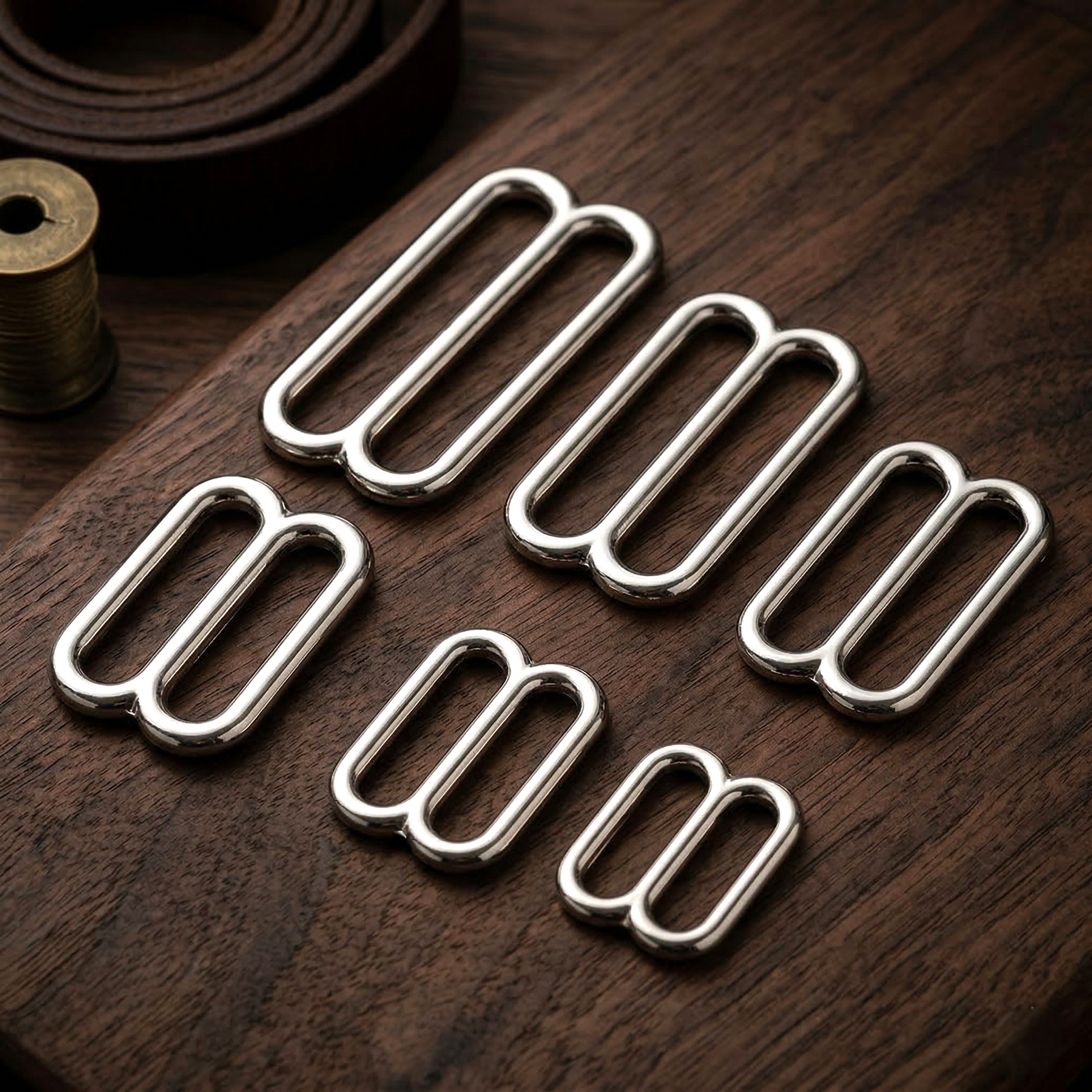 Metal sliders with perfectly smooth edges. Most often used for tightening, shortening, or joining. Ideally suited for making luggage (suitcases, backpacks, handbags, bags, and suitcases) or for sporting goods and dog equipment (collars). The parameter values given in the table refer to the inner height/width of each opening and not the overall dimensions of the slider. Choose from sizes 16–50 mm.