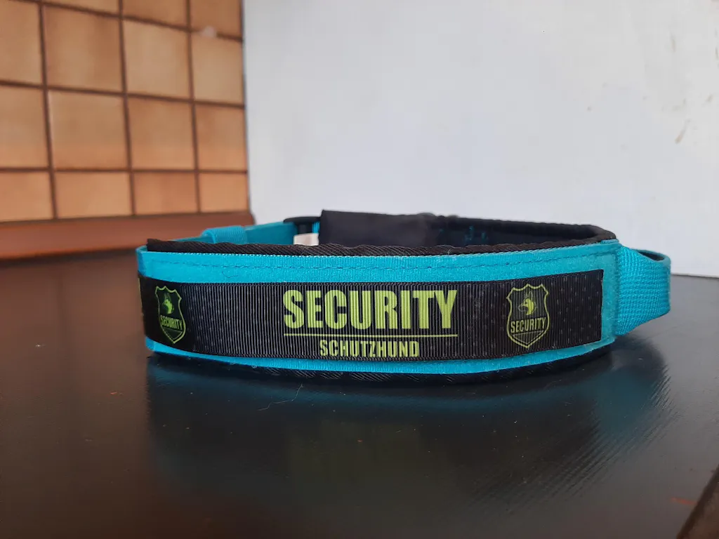 Dieses markante Ripsband aus unserer Eigenproduktion sorgt für Respekt und Sicherheit auf den ersten Blick. Der leuchtende Schriftzug „SECURITY“ in Neon-Gelb sticht auf dem tiefschwarzen Hintergrund sofort ins Auge und wird durch den Zusatz „SCHUTZHUND“ perfekt ergänzt. Ein passendes Wappen mit Hundekopf-Profil rundet das professionelle Design ab. Als besonderes Geheimnis für den genauen Betrachter haben wir im schwarzen Hintergrund ganz dezent kleine Pfotenabdrücke versteckt – ein feines Detail, das die Liebe zum Hund auch im harten Einsatz zeigt.