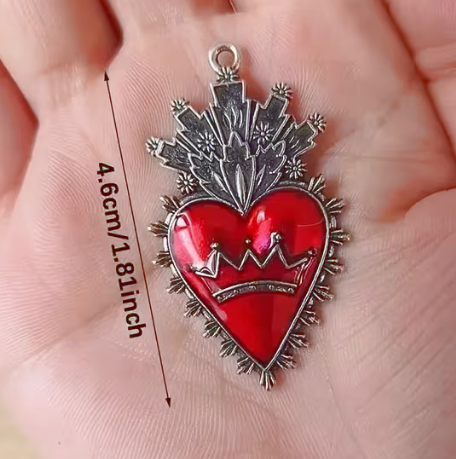 Diese eindrucksvollen Anhänger im Stil der "Sacred Hearts" (Heilige Herzen) sind echte Blickfänger. Das Herzstück bildet jeweils ein tiefrotes, glänzendes Element in Emaille-Optik, das von einer detaillierten Fassung in Antik-Silber umgeben ist.