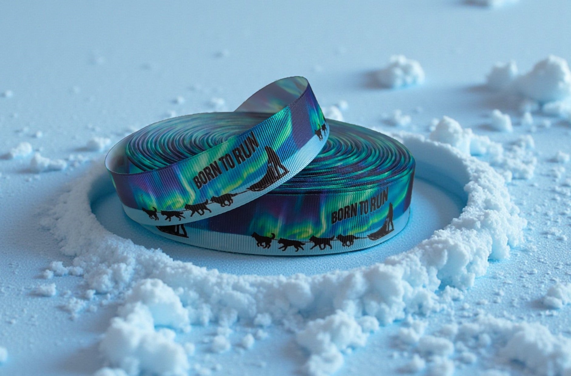 Dieses exklusive Ripsband aus unserer Eigenproduktion ist eine Hommage an die Kraft und Ausdauer von Schlittenhunden. Das Motiv zeigt ein beeindruckendes Hundegespann mit Musher vor der faszinierenden Kulisse leuchtend grüner Nordlichter auf dunklem Nachtblau. Der Schriftzug „BORN TO RUN“ unterstreicht den unbändigen Bewegungsdrang und die Leidenschaft dieser besonderen Tiere.