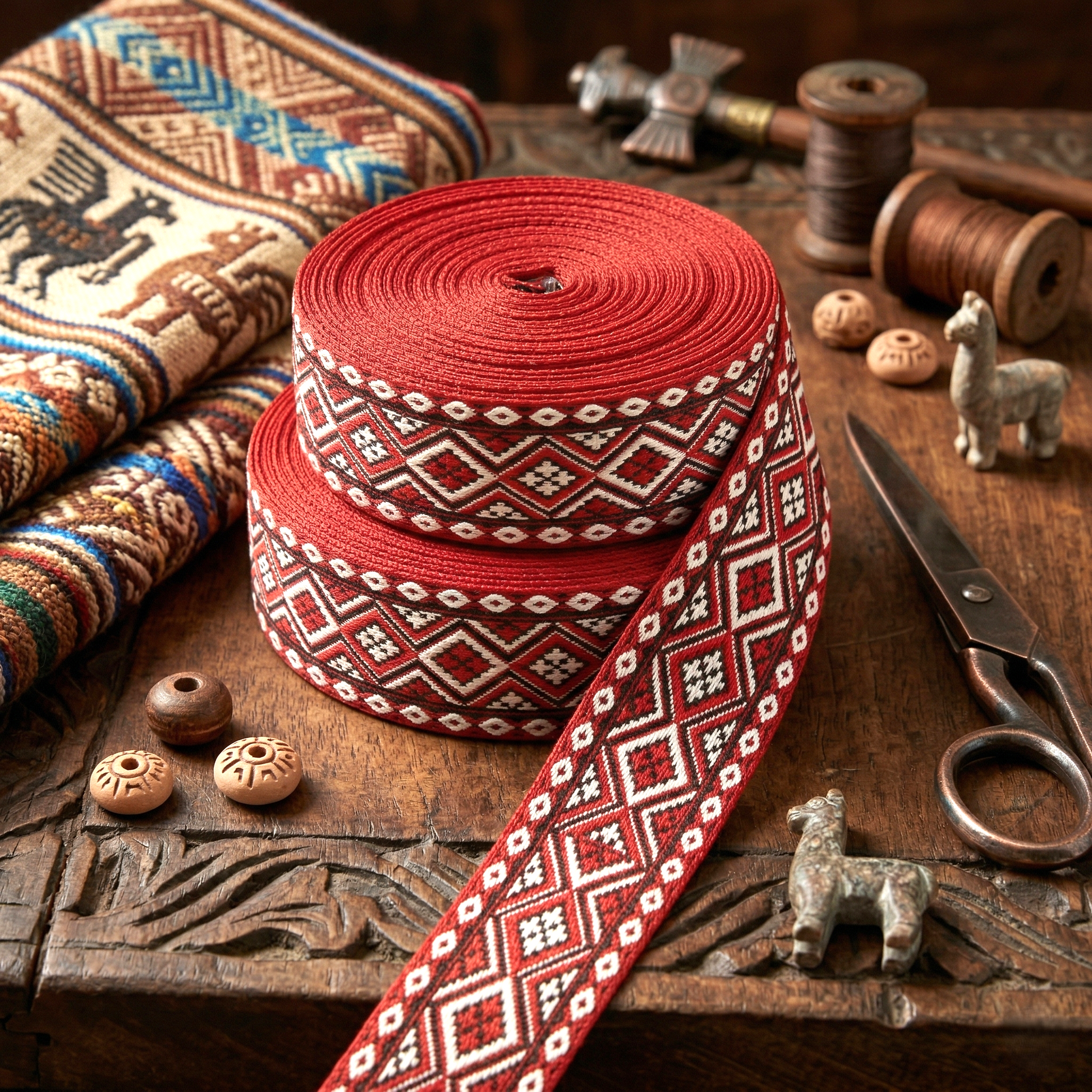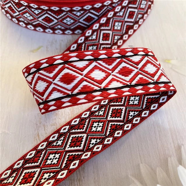 🏺 Traditionelles Ethno-Webband in kräftigem Rot mit geometrischem Rautenmuster – 33 mm ✨