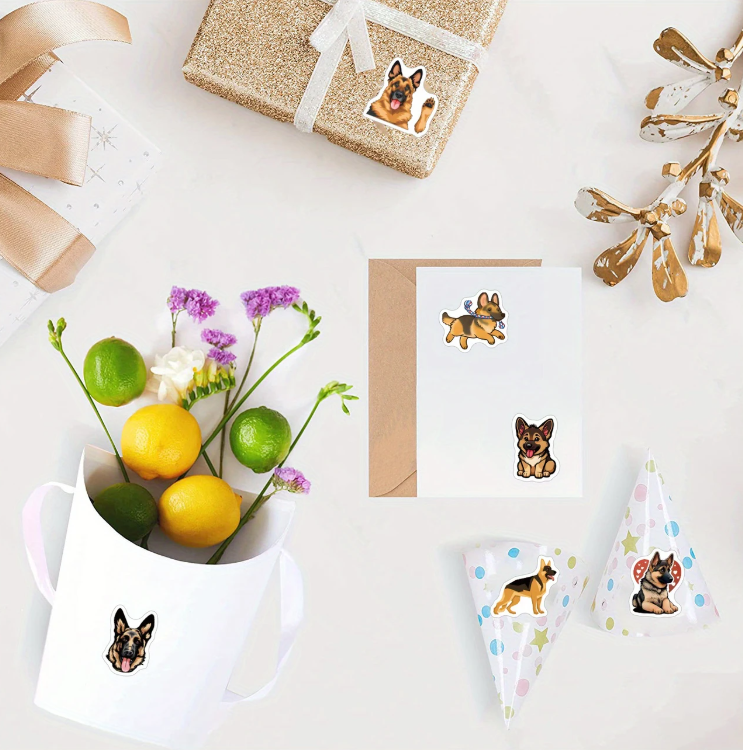 Eigenschaften: • Selbstklebend & rückstandslos entfernbar • Verschiedene Motive: Welpen & erwachsene Schäferhunde • Durchschnittsgröße: ca. 2,4 cm • Perfekt für Deko, Post & kreative Projekte