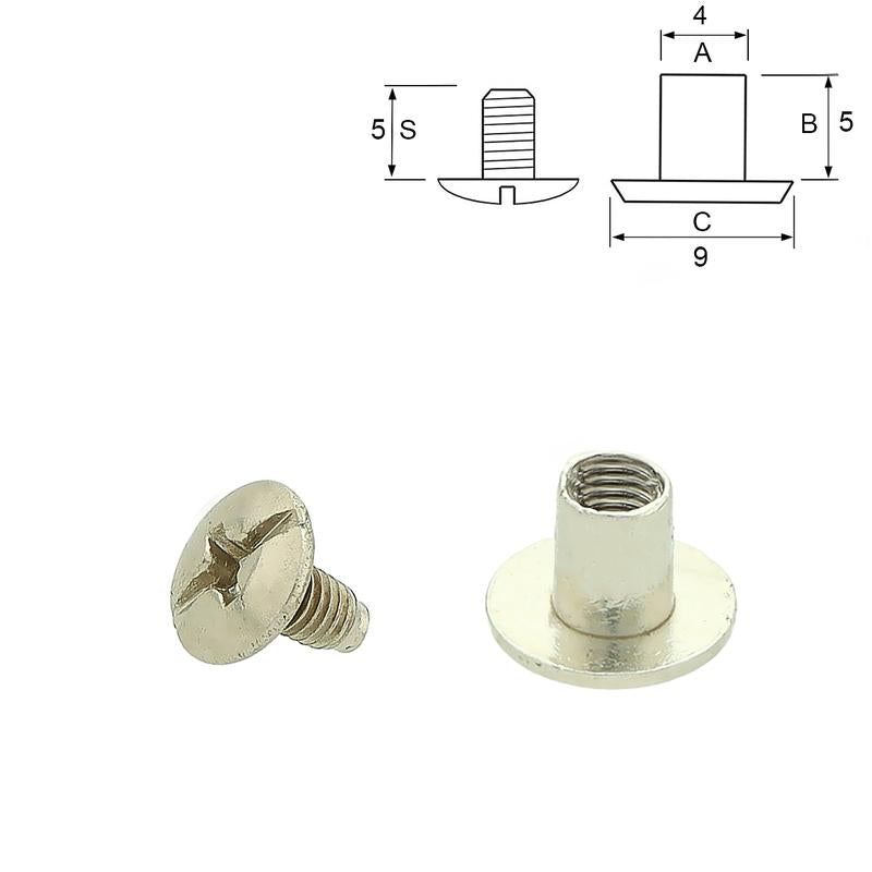 Die Metall-Buchschraube (vernickelt) wird zur Herstellung von Gürteln, Hundehalsbändern und zum Verbinden verschiedener Materialien verwendet. Sie besteht aus zwei Teilen, einer Hohlschraube mit festem Kopf und Innengewinde, die als geschlossene Mutter dient, und dem gegenüberliegenden Schraubenteil zum Festziehen der Verbindung. Der Vorteil dieser Schraubverbindung ist die einfache Handhabung, beispielsweise beim Wechseln von Gürtelschnallen oder beim Verbinden zweier Materialien.