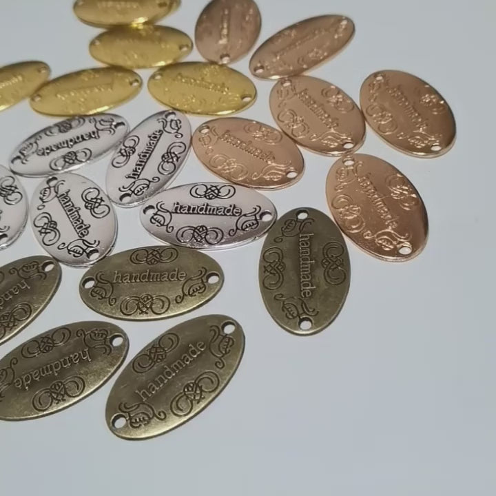 Zeig stolz, dass es selbstgemacht ist! Diese edlen Metall-Anhänger mit der Aufschrift "handmade" sind das krönende Detail für deine DIY-Projekte. Sie haben eine klassische, ovale Form und sind mit feinen, verschnörkelten Ornamenten verziert, die ihnen einen charmanten Vintage-Look verleihen.