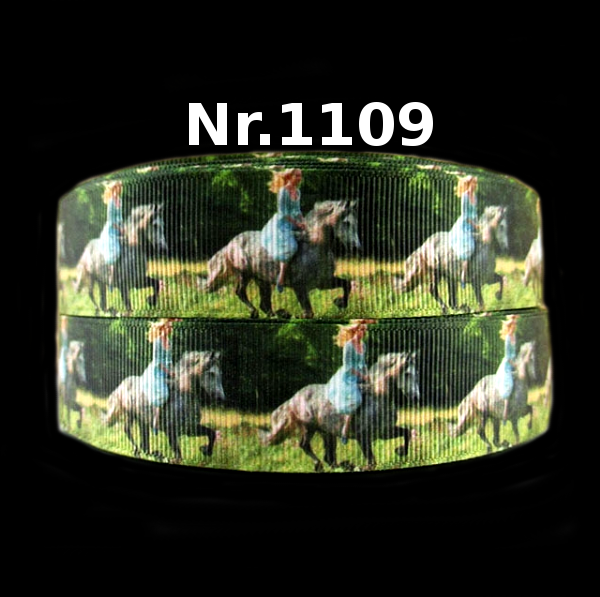 Dieses 25mm breite Band zeigt eine wunderschöne Fotografie einer Frau, die auf einem Pferd durch eine grüne Wiese reitet.