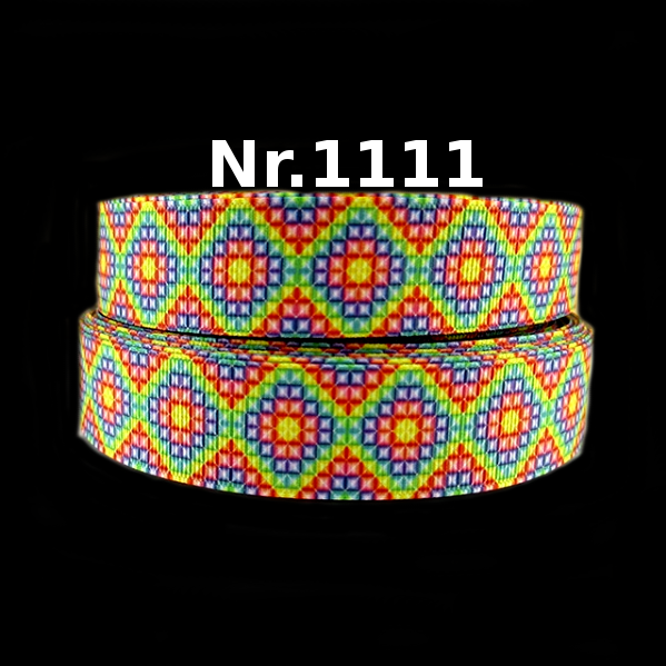 Dieses 25mm breite Band zeigt ein abstraktes Karomuster in leuchtenden, bunten Farben, das an den psychedelischen Stil erinnert.