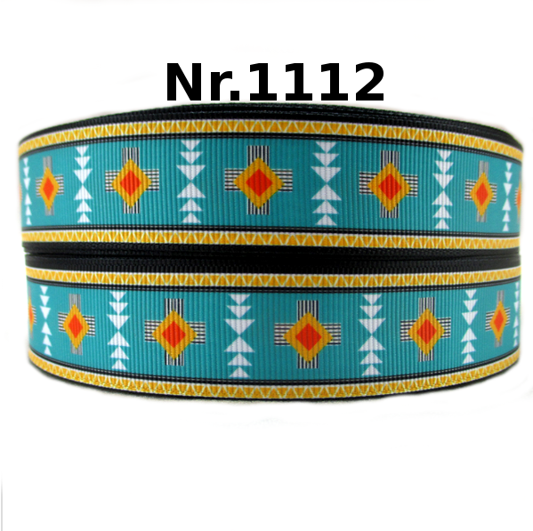 Dieses 25mm breite Band kombiniert einen türkisen Hintergrund mit gelb-schwarzen Rändern und stilvollen Boho-Motiven.