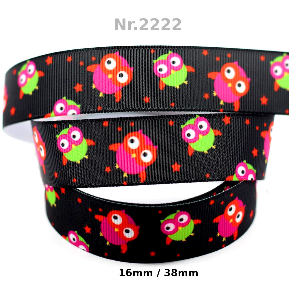 Lustige Vögelchen im Comic-Stil treffen auf kleine Sternchen – ein verspieltes und farbenfrohes Design! Der schwarze Hintergrund hebt die niedlichen Details besonders hervor und macht das Band zu einem echten Hingucker für jedes kreative Projekt.