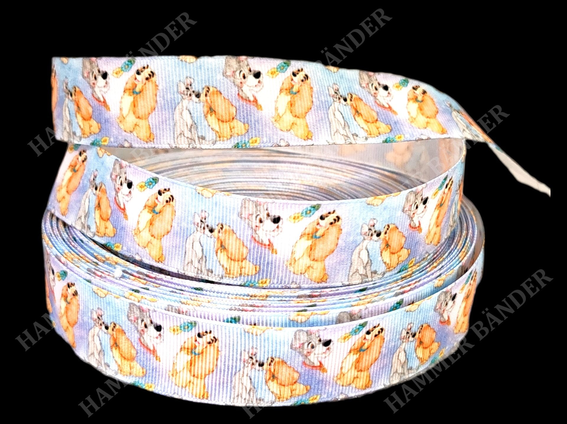 Dieses 25mm breite Band zeigt die ikonischen Charaktere aus dem Disney-Klassiker vor einem sanft bunten Hintergrund in zarten Pastelltönen.