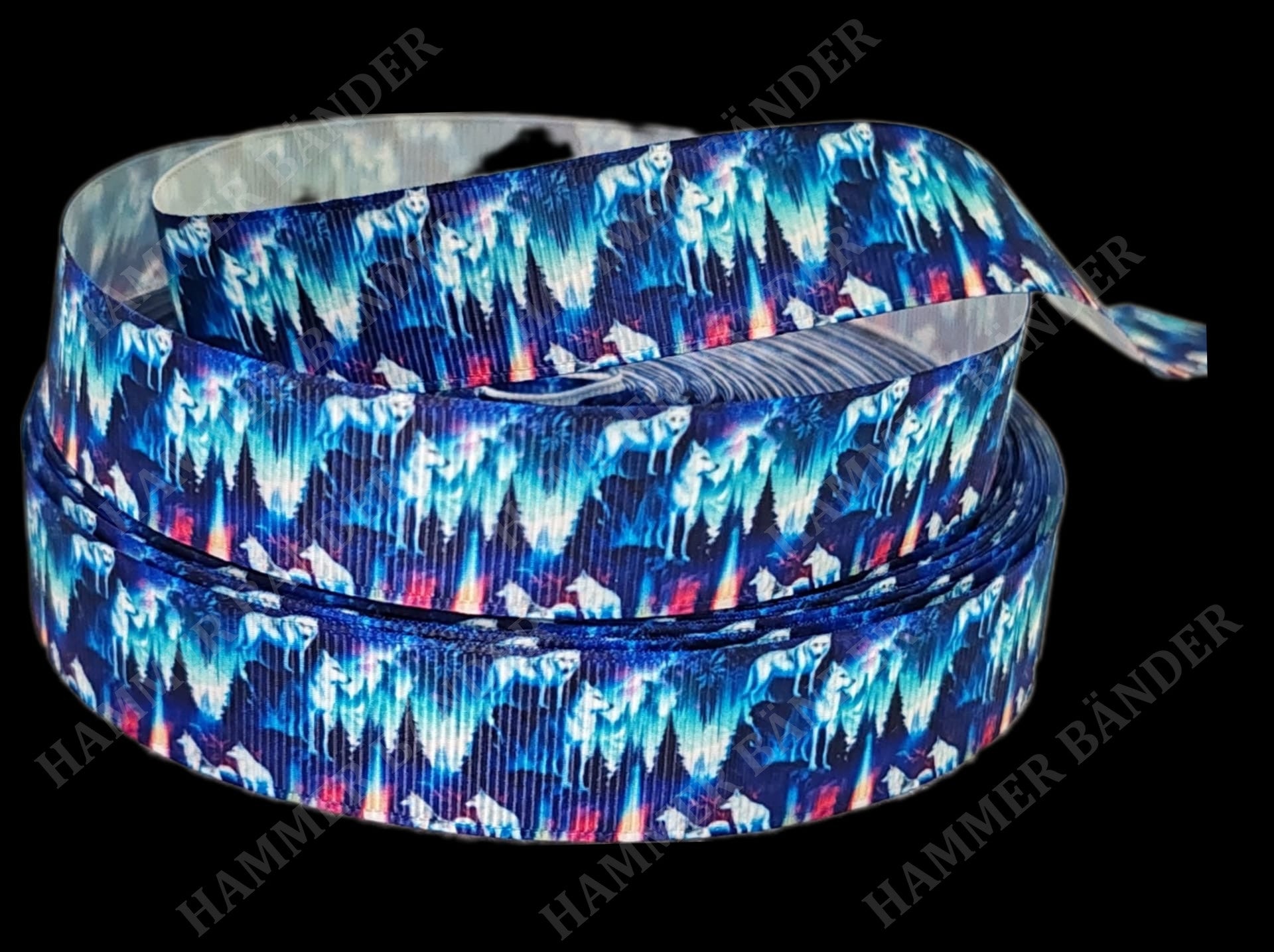 Dieses 22mm breite Band zeigt majestätische Wölfe inmitten eines fantasievollen Waldes, gestaltet in intensiven Farben und mit hohem Kontrast.
