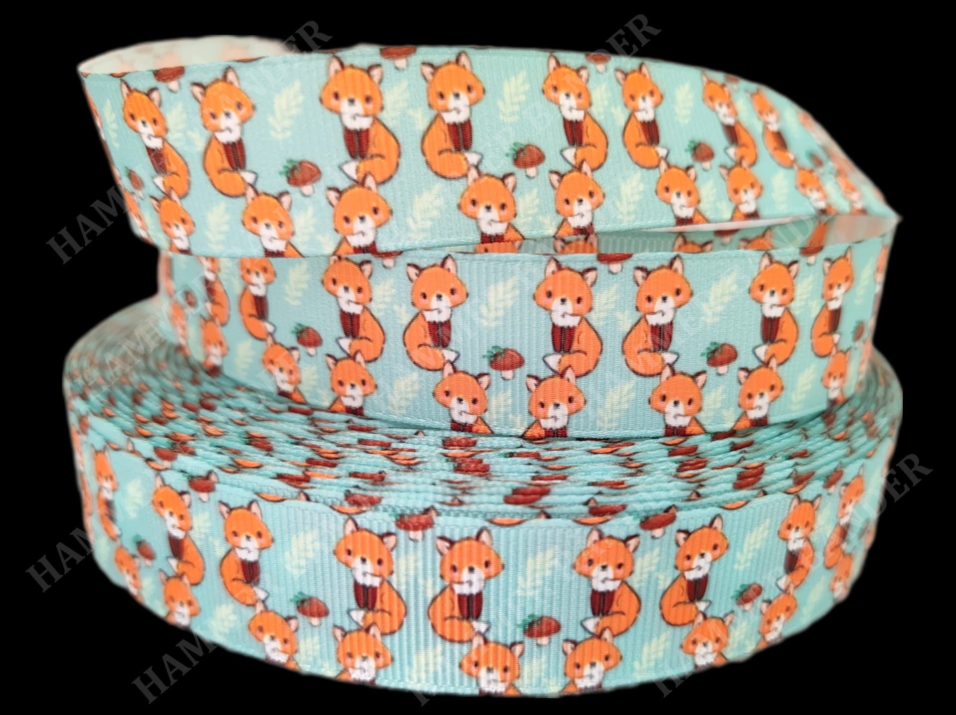 Dieses 22mm breite Band zeigt niedliche Zeichnungen von Füchsen, ergänzt durch kleine Pilze und Ähren von Weizen auf einem pastellgrünen Hintergrund.