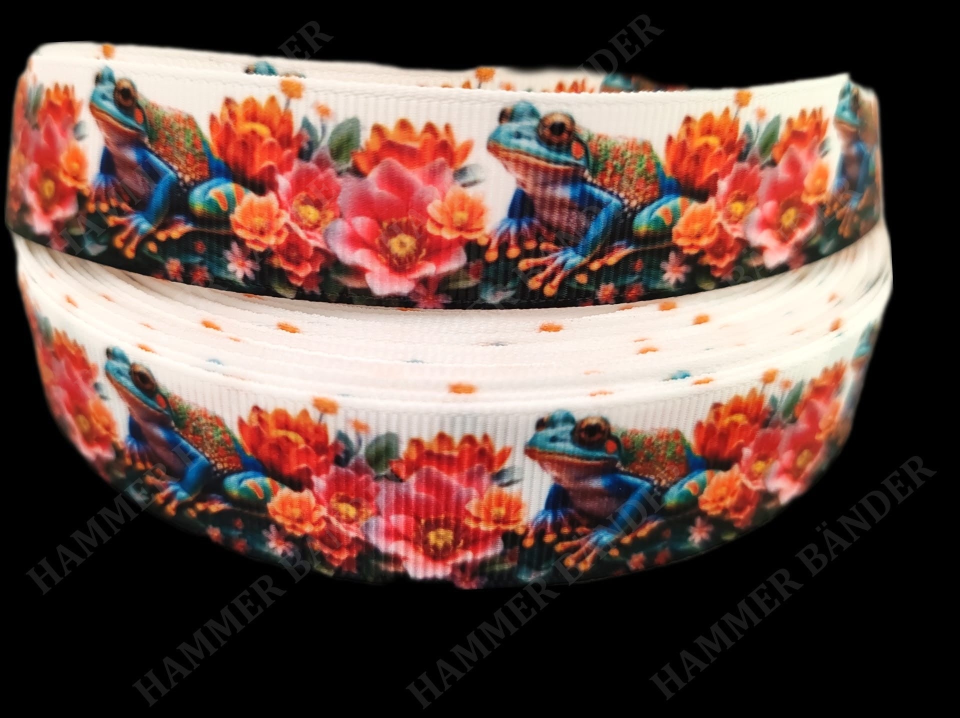 Dieses 22mm breite Band zeigt einen bunten Frosch, der auf grünen Seerosenblättern sitzt, umgeben von leuchtenden, kontrastreichen Seerosenblüten auf einem weißen Hintergrund.