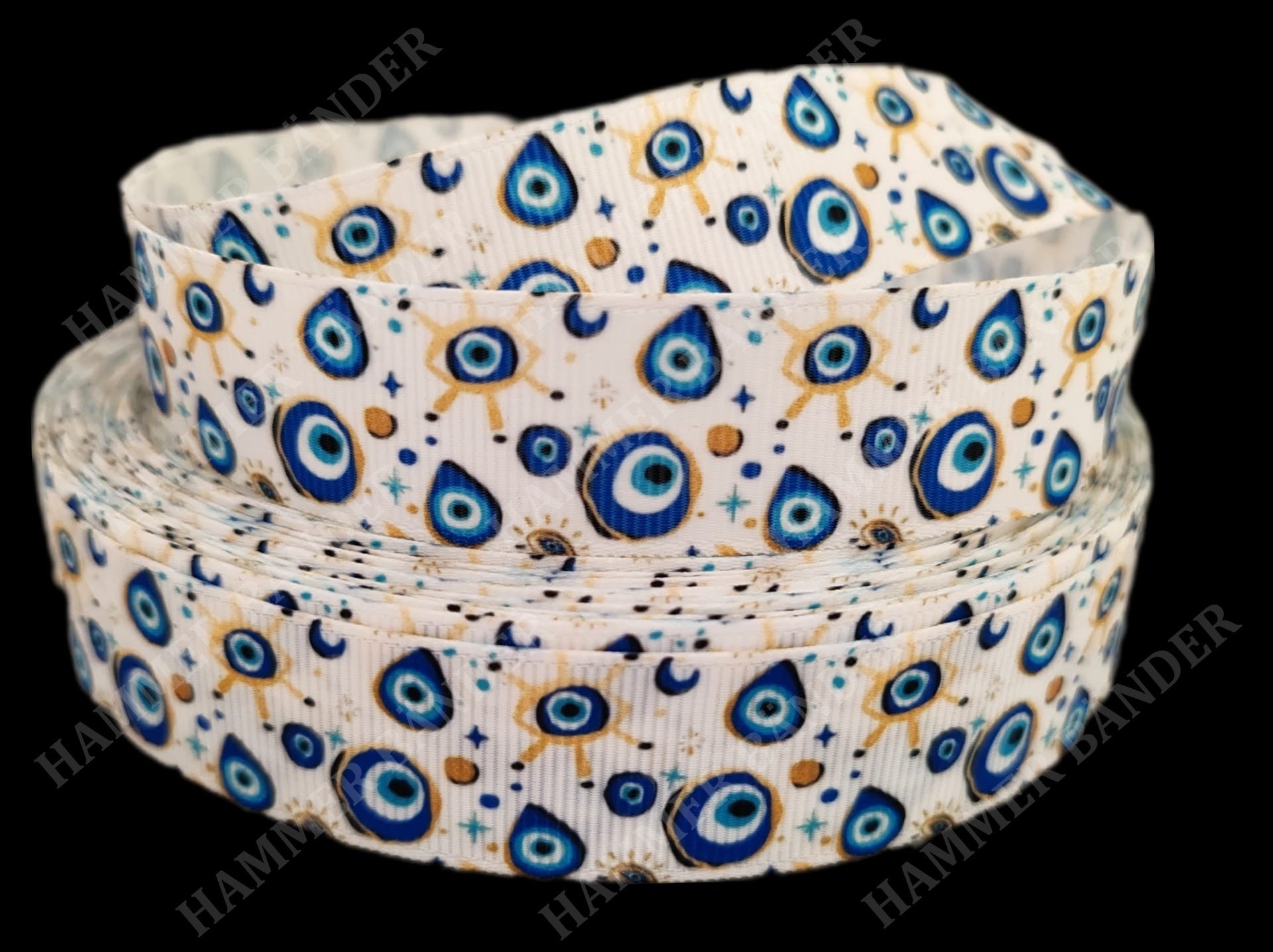 Dieses 22mm breite Band zeigt zahlreiche Nazaar-Symbole in unterschiedlichen Formen – als Auge, Tropfen und Kreis – ergänzt durch kleine Sterne und Monde auf einem weißen Hintergrund.