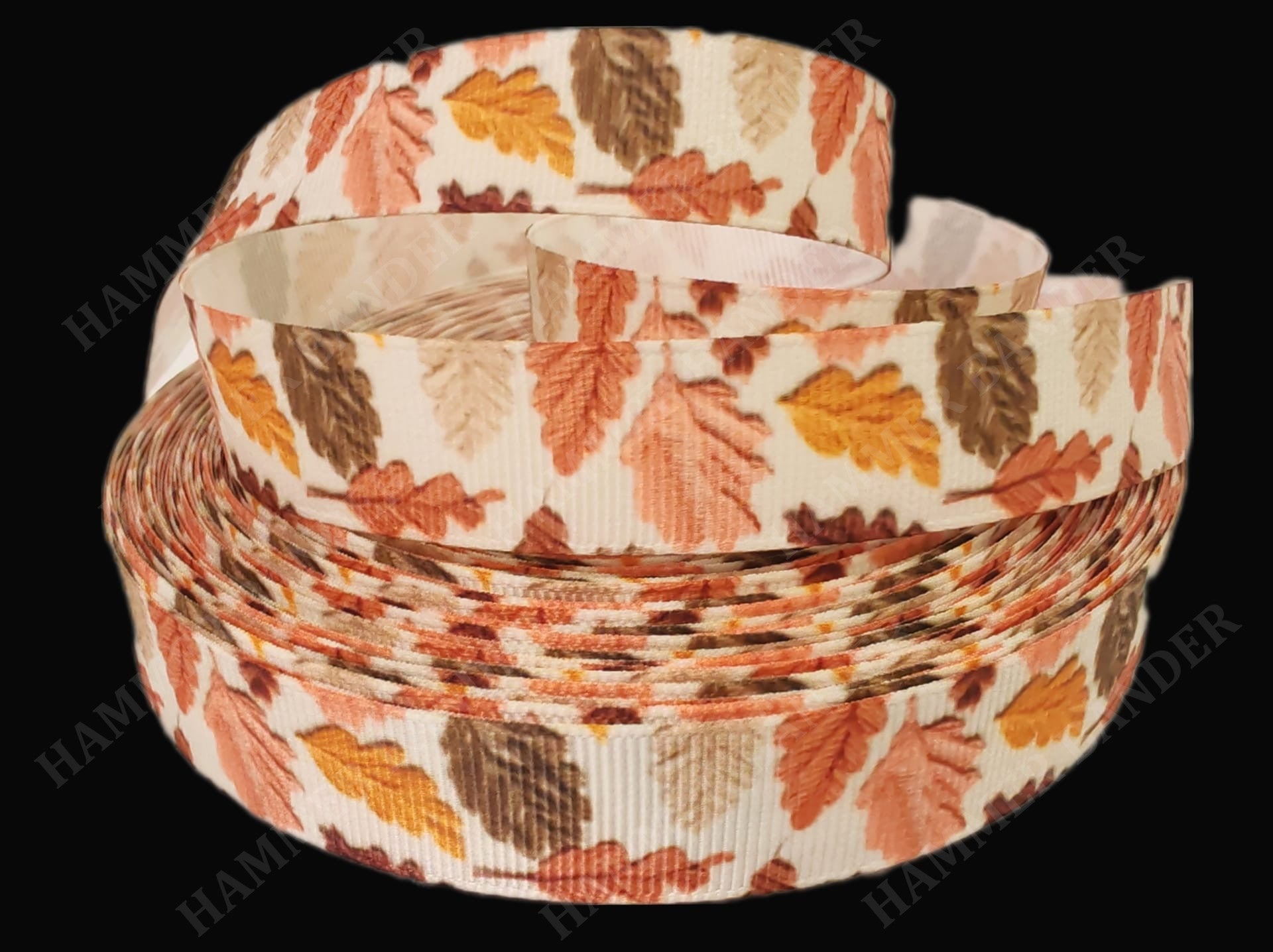 Dieses 19mm breite Band zeigt detailreiche Herbstblätter in warmen Farben, gestaltet im Stick-Look, der eine beeindruckende 3D-Optik erzeugt.