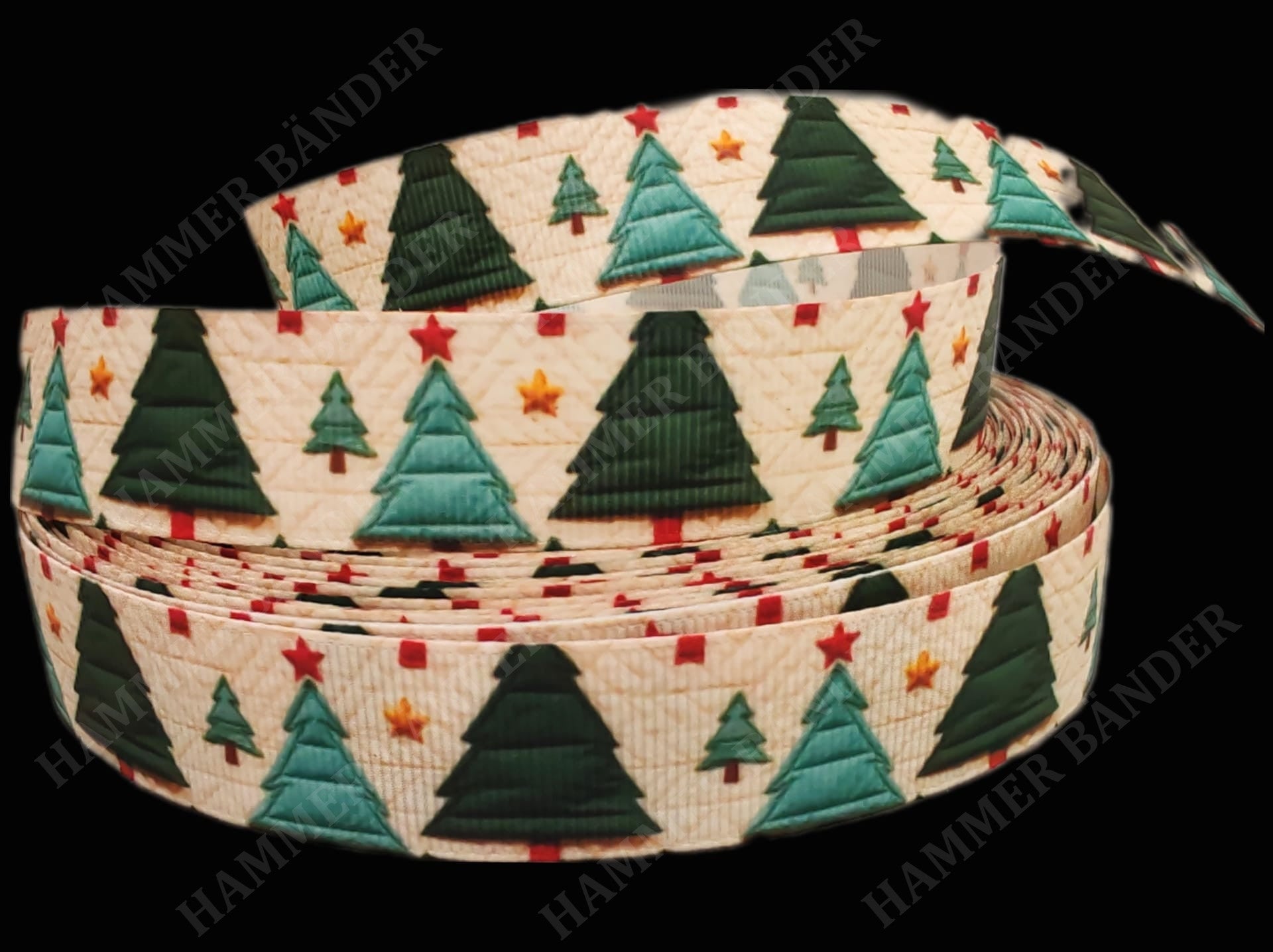Dieses 22mm breite Band zeigt Weihnachtsbäume, die wie aus dickem Winterjackenstoff gefertigt wirken, ergänzt durch zarte Weihnachtssterne.