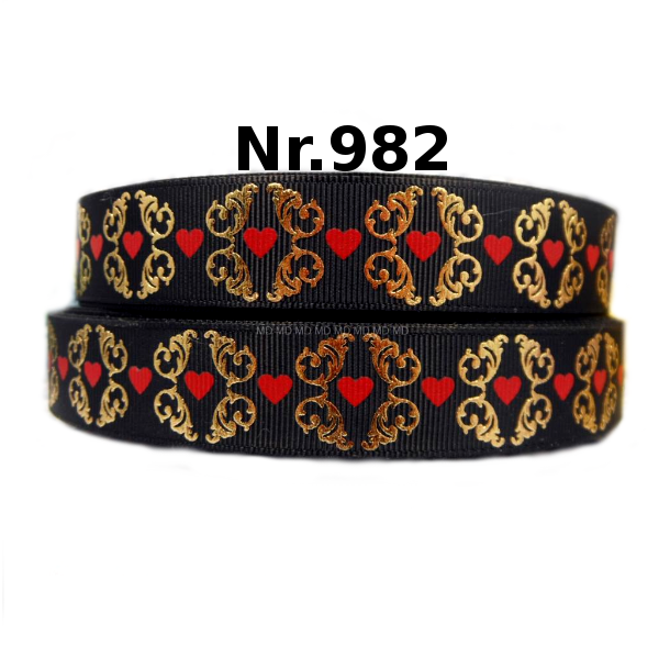 Dieses schwarze Ripsband besticht durch leuchtend rote Herzen, die von prächtigen goldenen Ornamenten im Barock-Stil umrahmt werden. Ein sehr festliches und hochwertiges Design.Perfekt für elegante Hundehalsbänder, Weihnachtsdeko oder Geschenke für die Liebsten, die einen Hauch von Luxus ausstrahlen sollen.