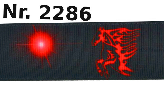 Dieses exklusive 25mm breite Band hat einen tiefschwarzen Hintergrund, auf dem sich leuchtend rote Sterne und kunstvoll gestaltete Tribals in der Form eines Pferdes abwechseln.