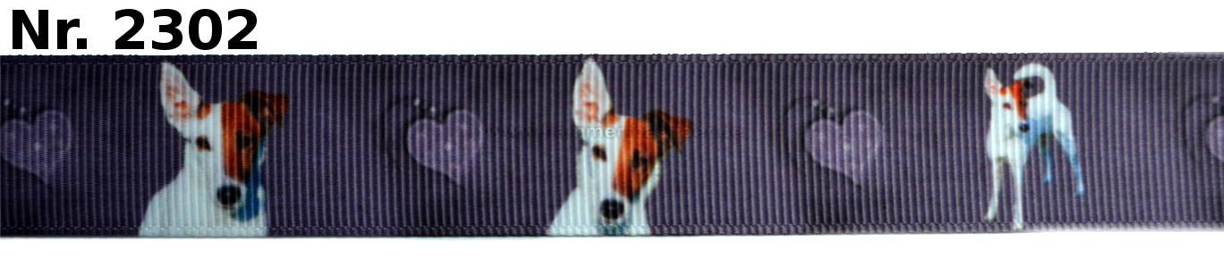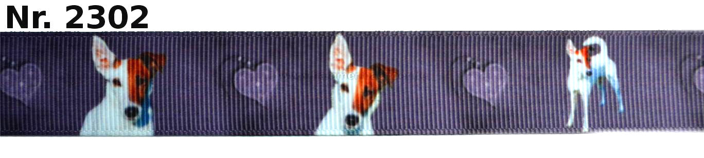 Dieses exklusive 22mm breite Band hat einen zarten graulichen Lilaton als Hintergrund und ist mit liebevollen Bildern eines charmanten Mischlingshundes verziert.