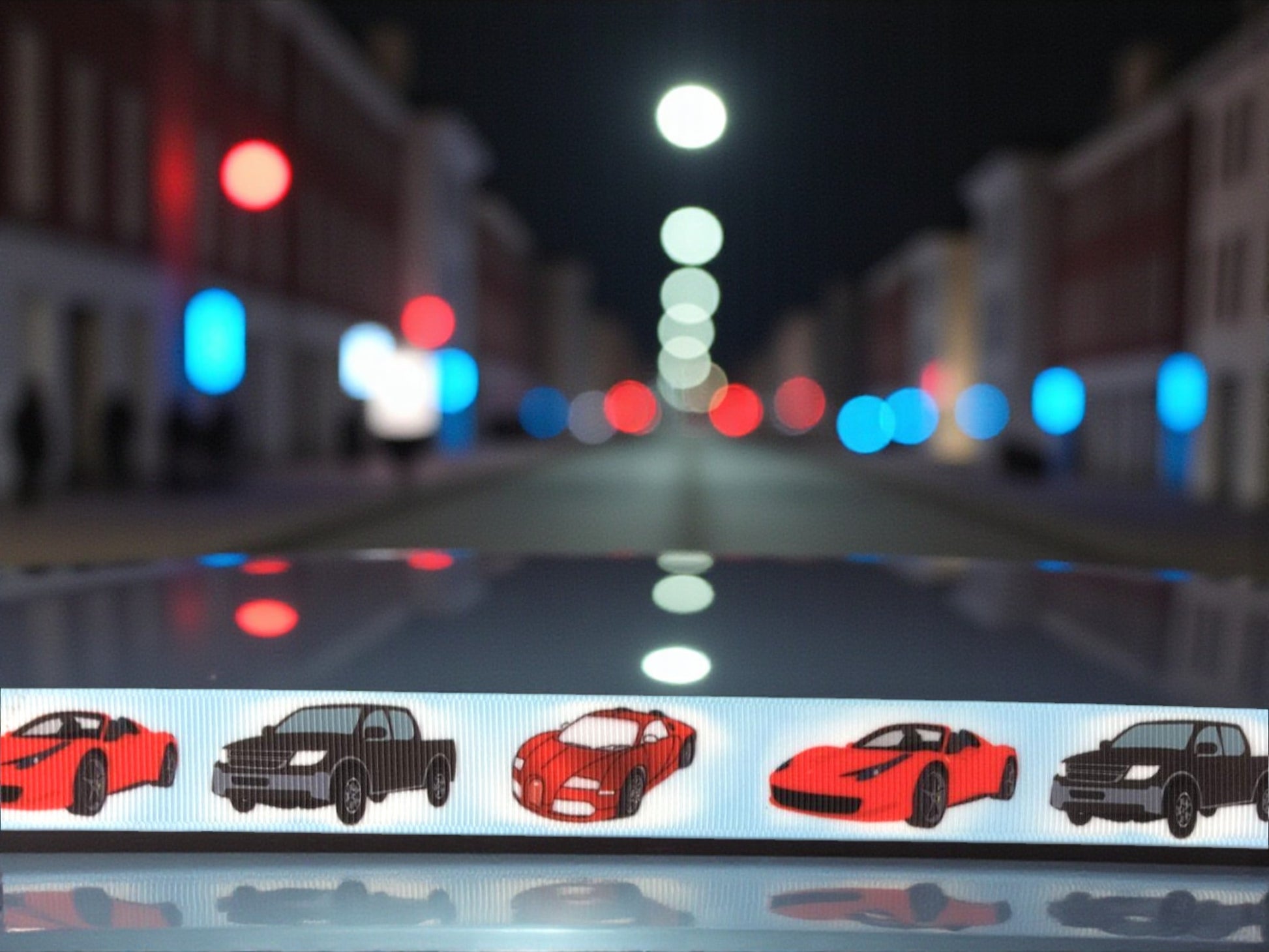 Jedes Auto wird durch einen weißen Schein hervorgehoben, was dem Design eine besondere Tiefe und Ausdrucksstärke verleiht.