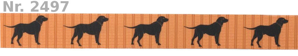Dieses exklusive 25mm breite Band hat einen gestreiften Hintergrund in warmen Brauntönen und zeigt die elegante schwarze Silhouette eines Labradors.