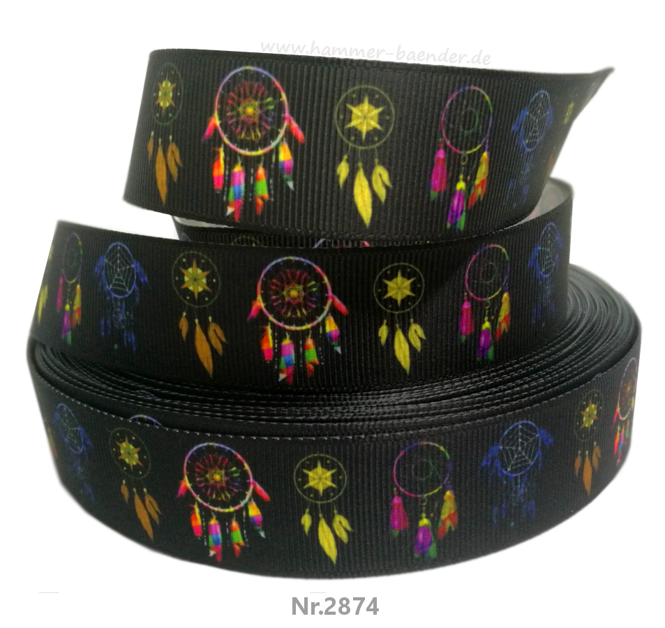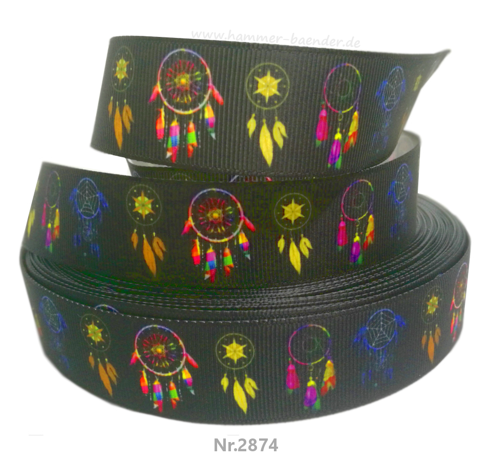 Dieses exklusive 25mm breite Band hat einen tiefschwarzen Hintergrund, der die bunten Traumfänger in leuchtenden Farben besonders gut zur Geltung bringt.