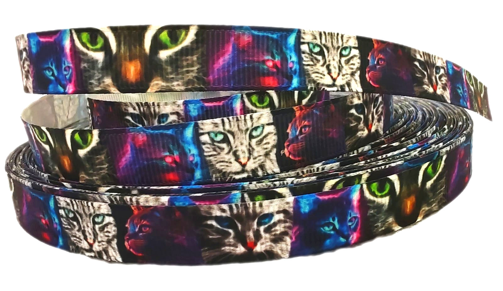 Dieses 13mm breite bedruckte Band zeigt verschiedene Katzen in einem abstrakten Stil, der mit leuchtenden Farben für einen modernen und kreativen Look sorgt.