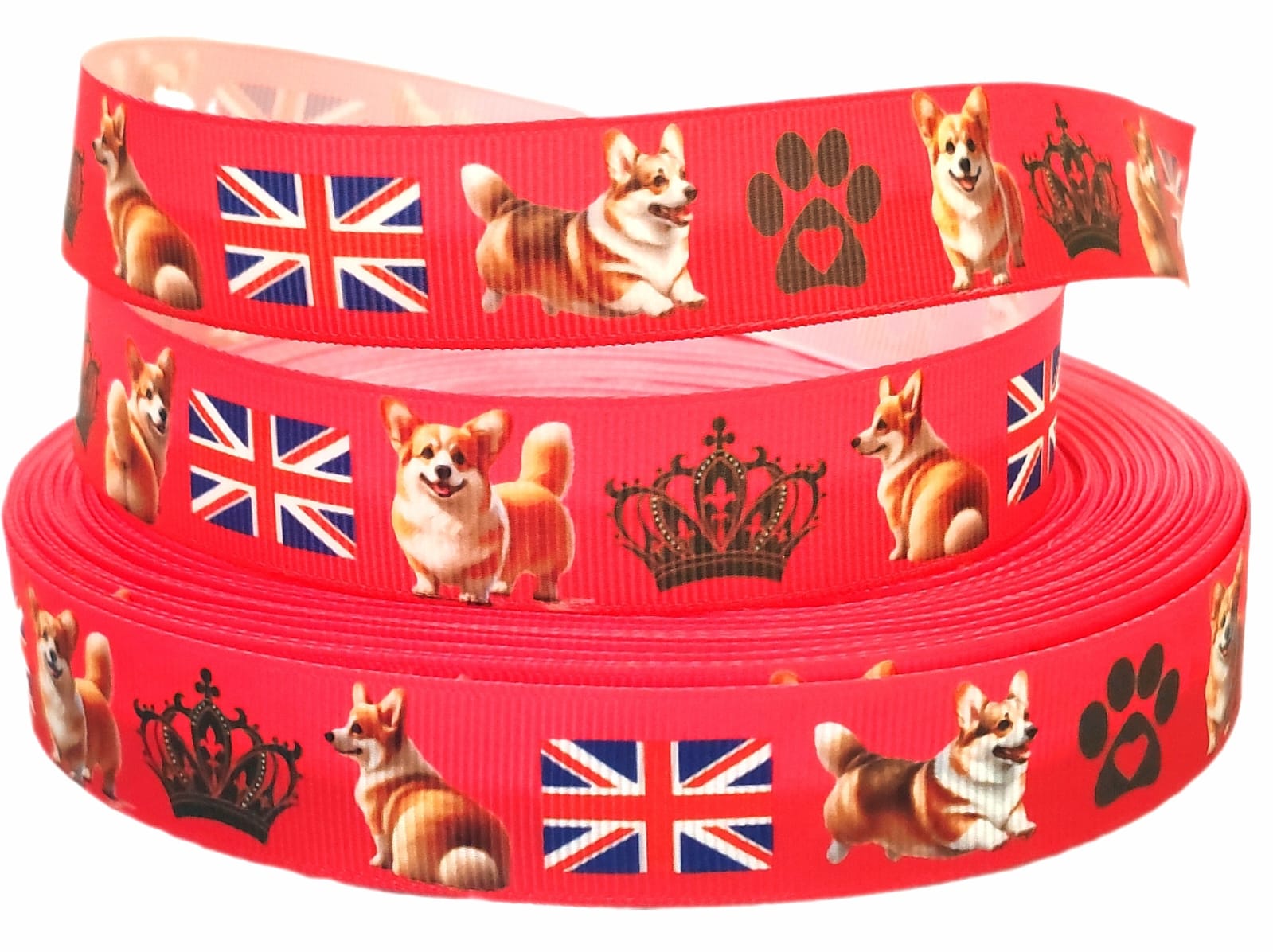 Der knallrote Hintergrund setzt die ikonische englische Flagge, zierliche Pfotenabdrücke, majestätische Kronen und liebevolle Bilder der Rasse Welsh Corgi in verschiedenen Posen perfekt in Szene.