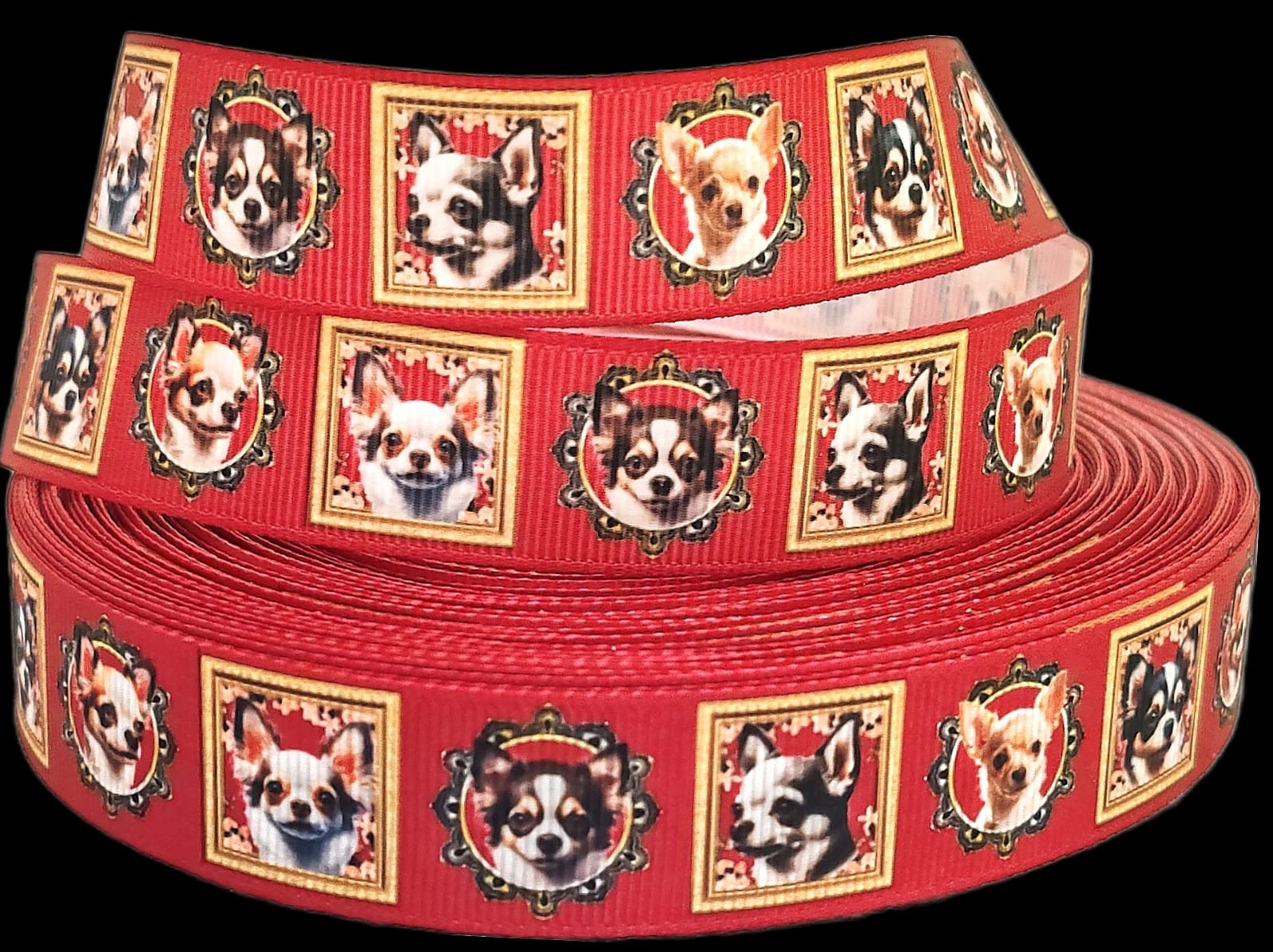 Dieses 22mm breite bedruckte Band zeigt kunstvoll eingerahmte Portraits verschiedener Chihuahuas, die auf einem weinroten Hintergrund besonders gut zur Geltung kommen.