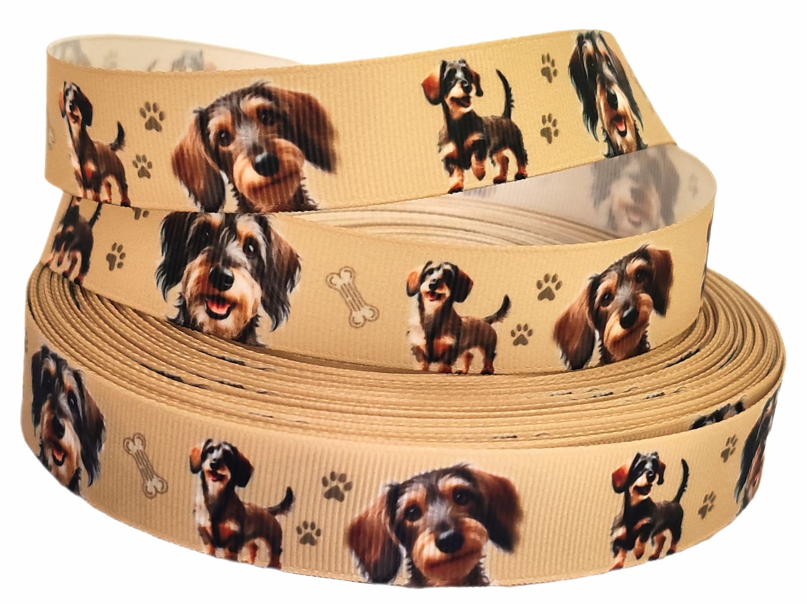 Dieses 22mm breite bedruckte Band zeigt liebevolle Zeichnungen eines deutschen Drahthaar Dackels in süßen Posen.