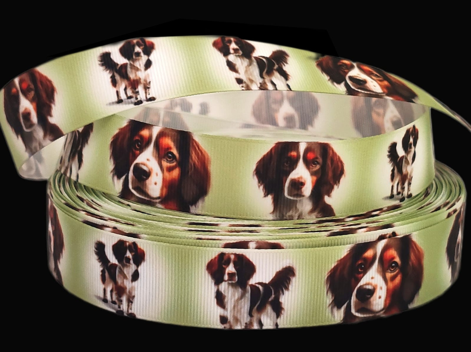 Dieses 25mm breite bedruckte Band zeigt detailreiche Zeichnungen eines Münsterländers in verschiedenen Posen, die seinen charmanten Charakter einfangen.