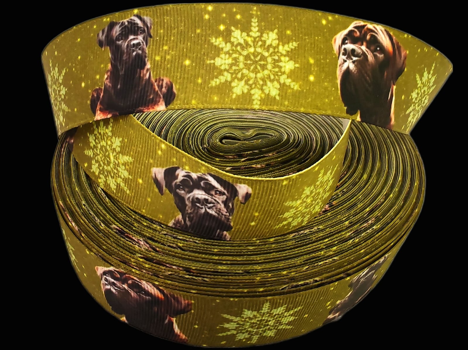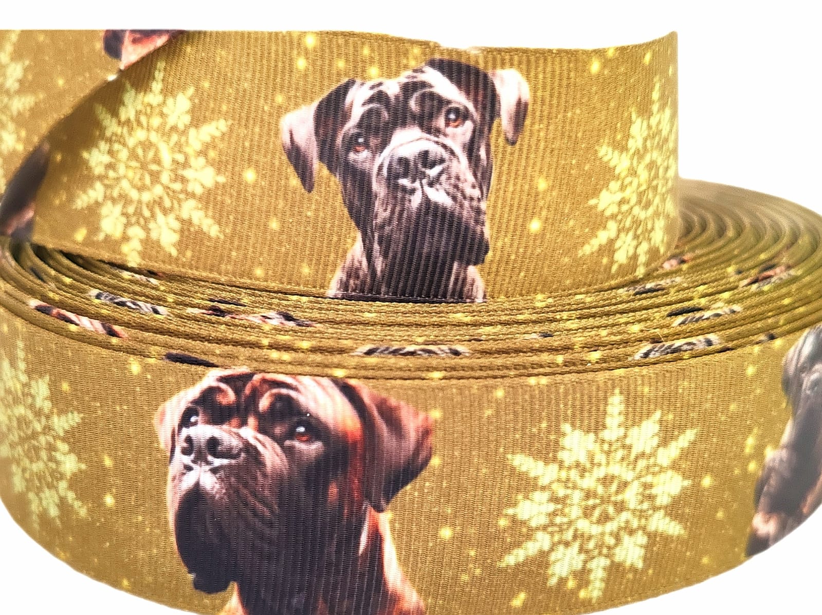Dieses 32mm breite bedruckte Band zeigt verschiedene Bilder eines Boxers, eingebettet in einen grünen Hintergrund mit zarten Verzierungen.