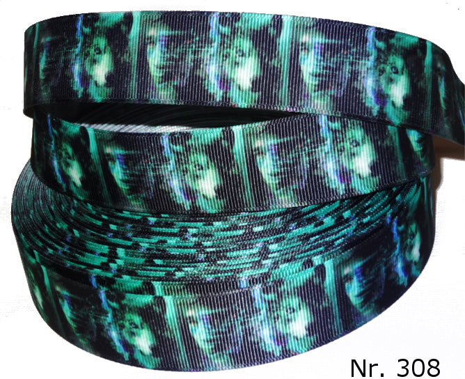Dieses exklusive 25mm breite Band ist in Schwarz und leuchtenden Grüntönen gehalten und zeigt das Gesicht eines Mannes neben dem eines Wolfs, wobei die Zeichnung auf faszinierende Weise zwischen beiden Gesichtern verschwimmt.
