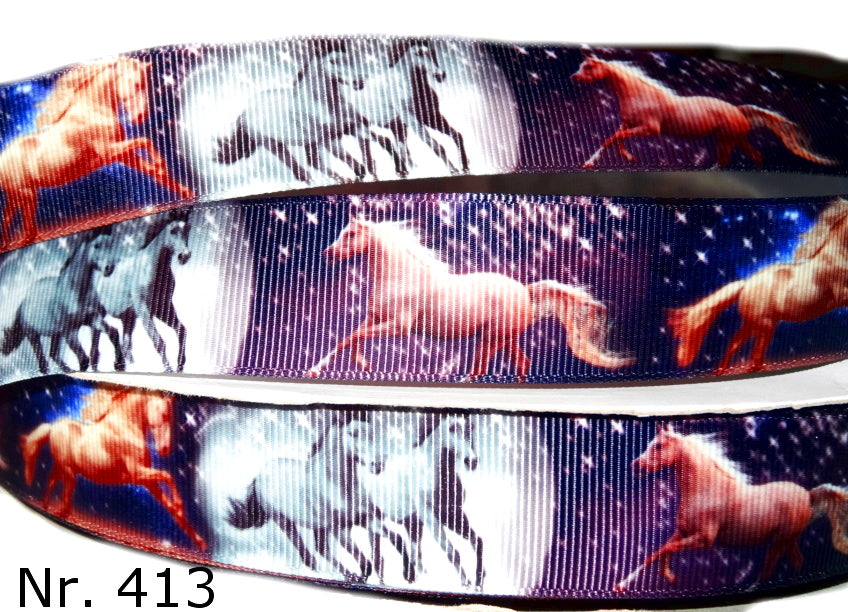 Dieses exklusive 25mm breite Band zeigt einen mystischen Hintergrund mit Mond und Sternenhimmel, auf dem majestätische Pferde abgebildet sind.