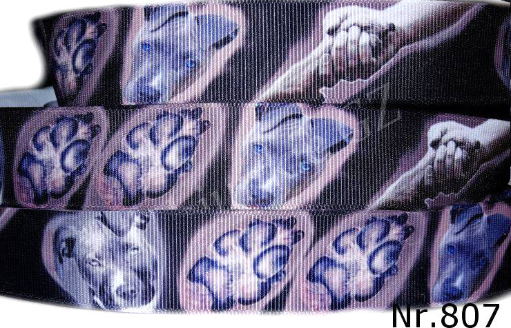 Dieses exklusive 25mm breite Band hat einen eleganten schwarzen Hintergrund und zeigt verschiedene Bilder eines Amstaffs, seine Pfote sowie eine liebevolle Hand, die eine Hundepfote hält.