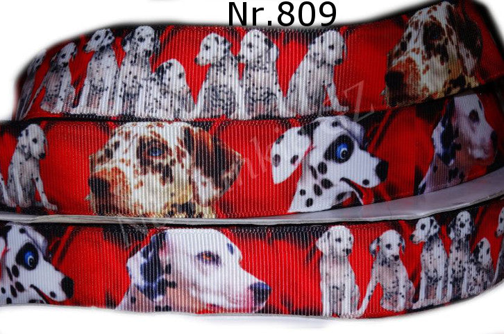 Dieses exklusive 25mm breite Band hat einen leuchtend roten Hintergrund und zeigt verschiedene Bilder von Dalmatinern und ihren niedlichen Welpen.