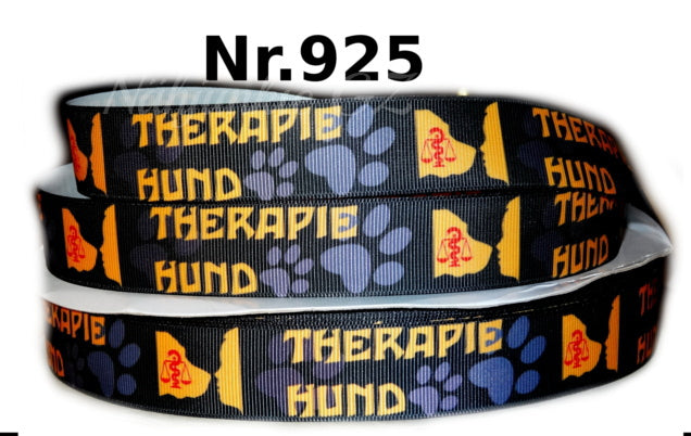 Dieses exklusive 25mm breite Band hat einen schwarzen Hintergrund und zeigt graue Pfotenabdrücke, eine Silhouette von einem Kind und einem Hund, sowie den Schriftzug „THERAPIEHUND“.