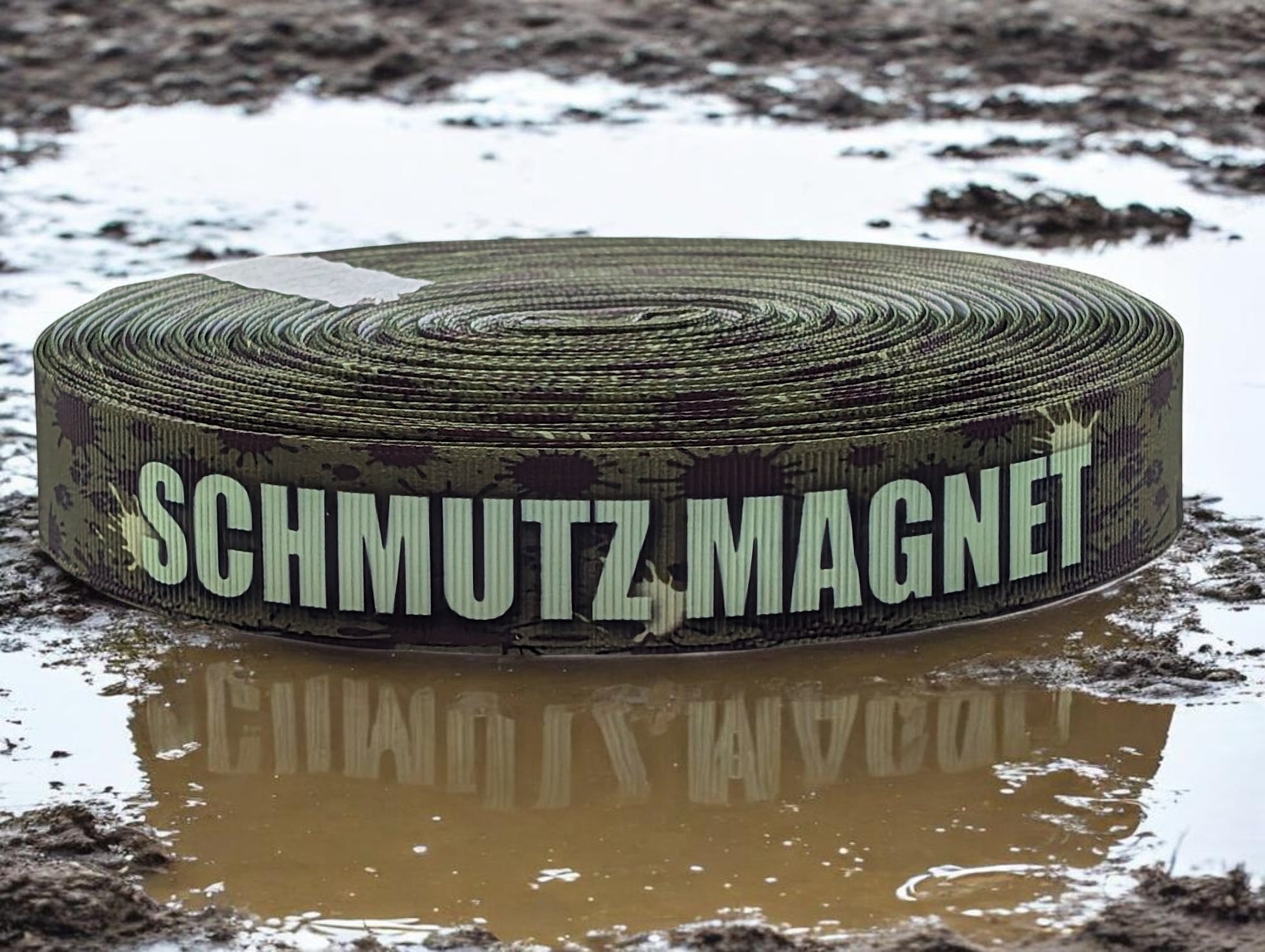 Zieht dein Hund Schlamm und Matsch magisch an? Findet er zielsicher die einzige Pfütze weit und breit? Dann ist dieses Ripsband aus unserer Eigenproduktion wie für ihn gemacht! Auf einem unempfindlichen, olivgrünen Hintergrund, der schon ab Werk mit dekorativen „Schlammspritzern“ verziert ist, prangt der treffende Schriftzug „SCHMUTZ MAGNET“. Ein humorvolles Design, das das unvermeidliche Chaos nach einem Spaziergang mit einem Augenzwinkern feiert – denn ein sauberer Hund hatte meistens keinen Spaß!