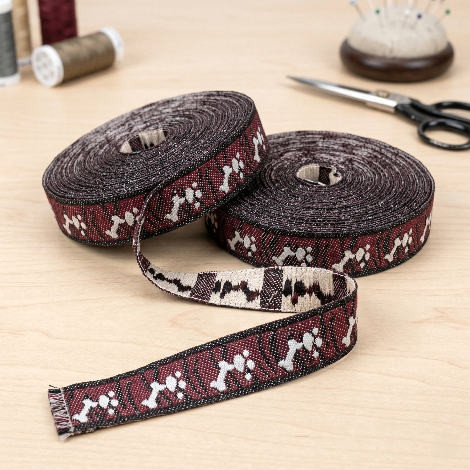 Da dieses Webband durch die bordeauxrote und schwarze Webung eher dunkel wirkt, empfehle ich Dir für Deine Projekte einen hellen Kontrast als Untergrund; dadurch strahlen die cremefarbenen Pfoten erst so richtig brillant. Verwende beim Aufnähen am besten eine feine Nadel und platziere Deine Naht exakt an den Außenkanten der Webkante, um die Tatzenspuren im Zentrum nicht zu durchtrennen. Versiegle die Schnittkanten nach dem Kürzen ganz kurz mit einer Flamme, damit die dichte Webstruktur dauerhaft gesichert bleibt und Dein handgefertigtes Werkstück eine absolut professionelle Optik behält!