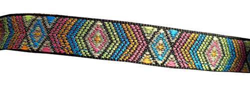 Dieses 14 mm breite Webband im Ethno-Stil bietet ein auffälliges Rauten-Muster, das auf dem schwarzen Hintergrund besonders zur Geltung kommt. Die bunten Farben und das schimmernde Garn verleihen dem Band einen frischen, lebendigen Look, der jedes Projekt aufpeppt.