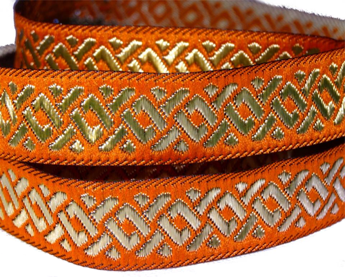 Dieses 16 mm breite Webband lässt deine Nähprojekte glänzen! Auf leuchtendem Hintergrund in Dunkelblau, Orange, Rot oder Rosa entfaltet sich ein detailreiches, mittelalterlich inspiriertes Ornamentmuster – kunstvoll gestickt mit schimmerndem Metallic-Garn in Gold. Perfekt für alle, die ihren Kreationen einen Hauch Historie und eine Prise Glanz verleihen möchten.