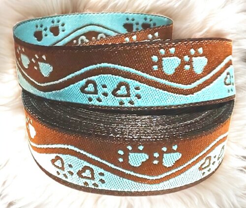 Dieses 16mm breite Band zeigt ein Wellenmuster in braun und hellblau, auf dem sich Pfotenabdrücke in den jeweils kontrastierenden Farben abheben.