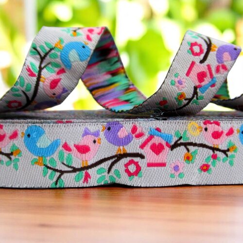 Auf grauem Hintergrund sitzen kleine, bunte Vögelchen auf einem zarten Zweig, begleitet von einem niedlichen Vogelhäuschen – perfekt für frühlingshafte oder naturinspirierte Näharbeiten. Ob Taschen, Deko oder Tierzubehör: Dieses Band macht einfach gute Laune!