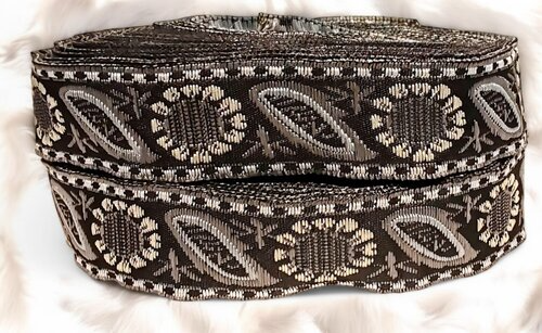 Auf schwarzem Grund entfaltet sich ein grob anmutendes, aber detailreiches Blumenmuster. Sonnenblumen und Blätter in Weiß, Grau und Silbertönen erinnern an handgestickte Textilien vergangener Zeiten. Die abgesetzten Ränder in Schwarz und Weiß unterstreichen den Kontrast und verleihen dem Band eine moderne Note. Ideal für rustikale oder naturverbundene Projekte mit besonderem Stil – von Taschen über Halsbänder bis hin zu Dekorationen.