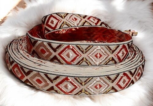 Auf einem warmen, cremefarbenen Hintergrund verschachteln sich filigrane Rauten zu einem hypnotischen Muster. Die Linien der Rauten schimmern in edlen Metallic-Tönen – tiefes Rot, sanftes Creme und erdiges Braun – und verleihen dem Design Tiefe und Eleganz. Ob für Taschen, Halsbänder oder dekorative Akzente: Dieses Band ist wie gemacht für stilvolle Details mit besonderem Flair.