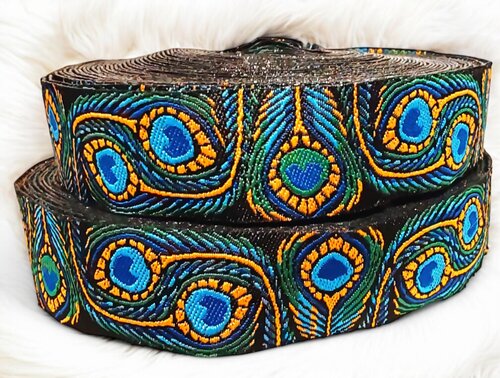 Auf schwarzem Hintergrund entfalten sich wunderschöne Pfauenfedern in Blau- und Grüntönen, mit feinen gelben Akzenten, die dem Band eine königliche Ausstrahlung verleihen. Die schillernden Farben und die filigranen Muster machen dieses Band zu einem echten Hingucker. Perfekt für alle, die ihre Projekte mit einer Prise Eleganz und Exklusivität aufwerten möchten – sei es für Taschen, Dekorationen oder Accessoires.