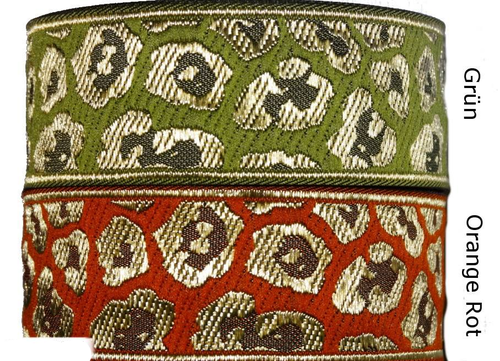 Tauche ein in die exotische Eleganz unserer Leopardenmuster Webbänder in Gold, wählbar in lebendigem Orange und Grün.
