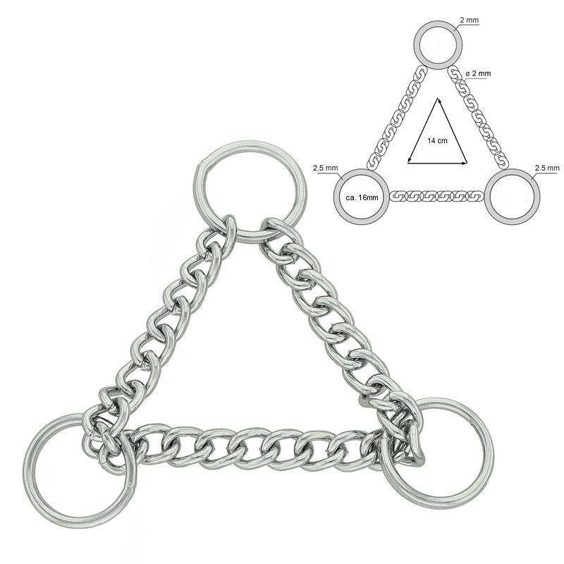 Verbindungshalskette zur Herstellung von Martingal (Zugstopp)-Hundehalsbändern.Bestehend aus kurzen geschweißten Gliedern, einem O-Ring und zwei D-Ringen oder aus 3 -Ringen(je nach ausführung). Der obere Ring dient zum Befestigen der Leine. Das Material des Halsbands selbst ist an den beiden Seitenringen befestigt. Es kann sich um Leder, Seil, Gurtband usw. handeln. Sie können aus 4 verschiedenen Kettenlängen wählen. Die in der Tabelle angegebene Länge gibt die Länge der Kette an, wenn sie vollständig gedehnt ist.
